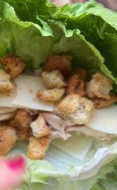 For each wrap, overlap 3 of the biggest lettuce leaves and fill them with the chicken, the Parmesan cheese, some croutons and some dressing.