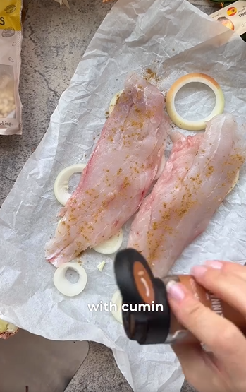 For the fish, line a baking tray with baking paper. Arrange onion slices, place the fish fillets on top, and season both sides with cumin, cinnamon, caraway, salt, and olive oil.