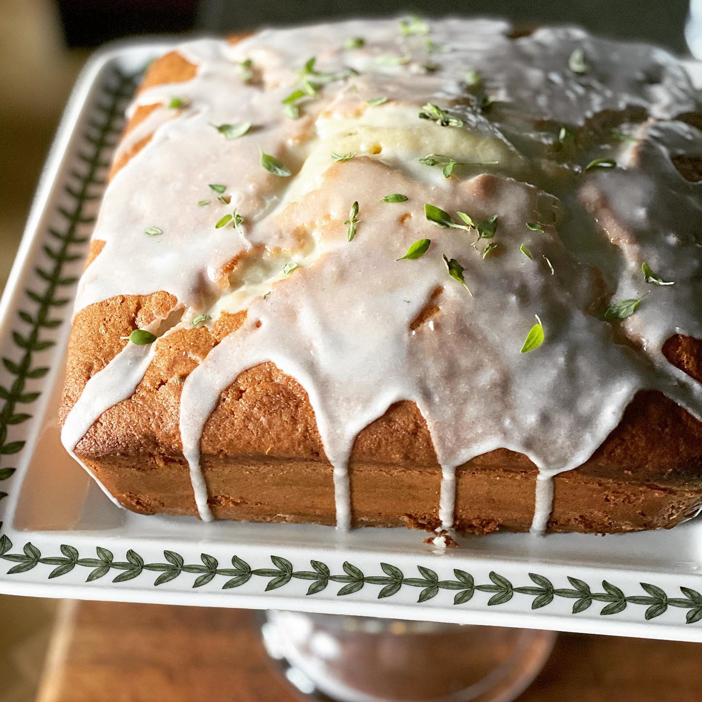 When the cake is cool, place on a wire rack. Sieve the icing sugar into a bowl and beat in the juice of the remaining lemon until you have a glaze. Pour over the cake and immediately sprinkle the top with thyme leaves.