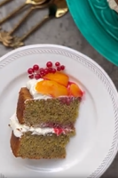 A super fresh pistachio cake with peaches, raspberry coulis and rose cream. This cake is the perfect summery cake, full of nutty and fruity flavors.