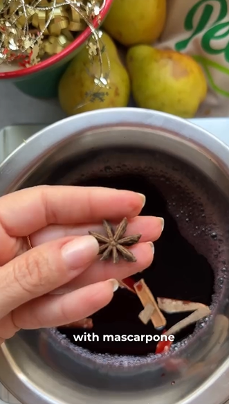 The whipped cream is made with mascarpone for richness and cardamom and vanilla for warm spice. I used a non-alcoholic wine simmered with star anise and vanilla then reduced it to create a velvety syrup.