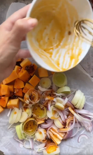 In a bowl, mix the honey, chili oil, chili paste, olive oil, and salt. Add the cubed butternut squash, sliced leek, and onion. Toss well to coat.